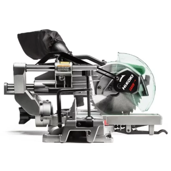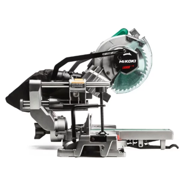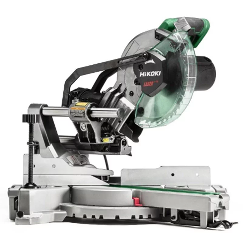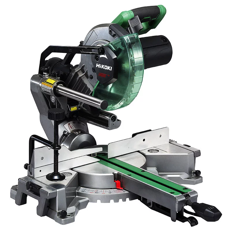 Scie radiale à coupe d’onglet HIKOKI muni d’une poignée soft-grip anti-vibrations, d’un marquage laser, d’un réglage fin pour une coupe en onglet.