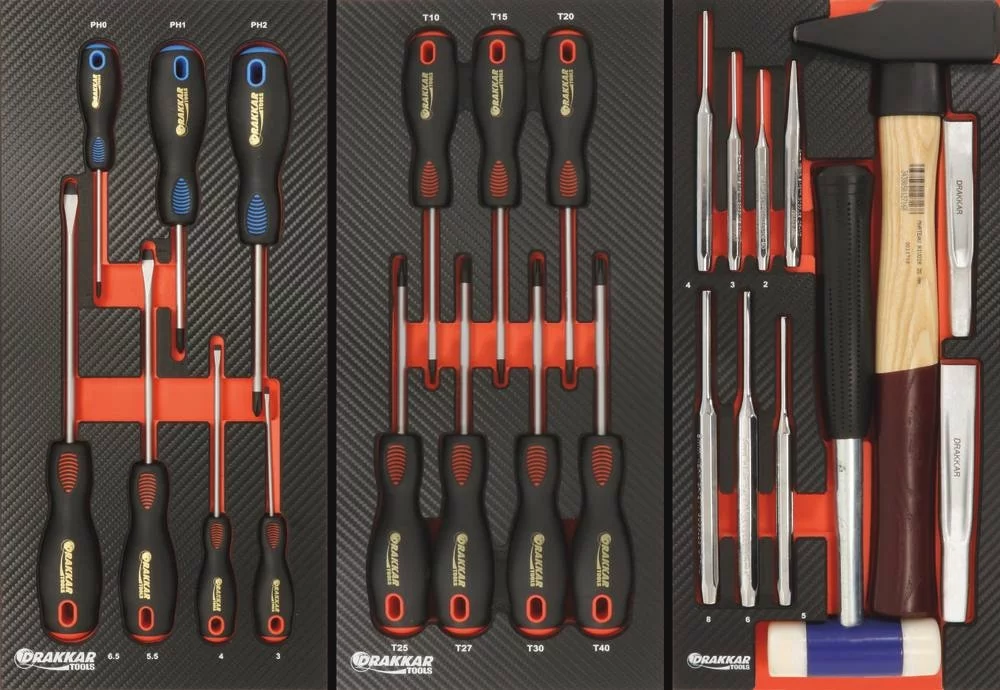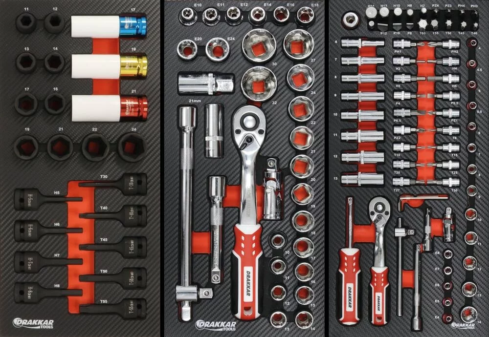 La servante Drakkar équipe l’utilisateur de nombreuses clés mixtes, douilles à chocs, pinces, tournevis et autres accessoires.