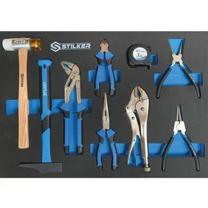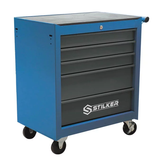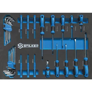 Servante d’atelier 5 tiroirs composée de 149 outils STILKER. Cette servante est dotée d’un plan detrvail recouvert d’un tapis de mousse, d’une fermeture centralisée et de tiroirs montés sur glissières télescopiques. Caractéristiques : Marque : STILKER Pièces dans le set : 180 outils Nombre de tiroirs : 5 Nombre de roues : 4 Dimensions intérieures des tiroirs : 565 x 405 mm Diamètre des roues : Ø 125 mm Dimensions : 680 x 458 x 845 mm Poids : 60 kg Module 109 outils : 17 douilles 1/2″ » : 10, 11, 12, 13, 14, 15, 16, 17, 18, 19, 20, 21, 22, 24, 27, 30, 32 mm 2 rallonges1/2″ » : 125 et 250 mm 1 adaptateur 1/2″ » 1 cardan 1/2″ » 18 embouts 1/4″ » : PH1-2 PZ1-2 H3-4-5-6 SL4-5,5-6,5 mm T8-10-15-20-25-27-30 8 douilles torx : E10-11-12-14-16-18-20-24 2 douilles à bougie 1/2″ » : 16 et 21 mm 5 douilles longues 1/2″ » : 14-15-17-19-22 mm 13 douilles 1/4″ » : 4-4,5-5-5,5-6-7-8-9-10-11-12-13-14 mm 2 rallonges 1/4″ » : 50 et 100mm 1 rallonge coulissante 1/4″ » : 115 mm 1 adaptateur 1/4″ » 1 porte embout 1/4″ » 1 tournevis porte embout 17 embouts 8 mm : Hex 7-8-10-12-14 mm SL : 8-10-12 mm PH 3-4 PZ3-4 TX 40-45-50-55 8 douilles longues 1/4″ » : 6-7-8-9-10-11-12-13 mm 5 douilles Torx E4-5-6-7-8 3 clés mâles 1,5-2-2,5 mm 1 cliquet 1/4″ » 72 dents 1 cliquet 1/2″ » 72 dents Module 34 outils : 5 tournevis plats : 2×38 – 4×100 – 5×100 – 6×125 – 8×150 mm 5 tournevis Philips : PH2x38 – PH0x75 – PH1x100- PH2x100 – PH3x150 mm 6 tournevis de précision : PH0x50 – PH00x50 – T6x50 – 1,5×50 – 2,5×50 mm 9 clés mâles hex : 1,5-2-2,5-3-4-5-6-8-10 mm 9 clés mâles Torx : T10-15-20-25-27-30-40-45-50 Module mousse 9 outils : 1 pince droite pour circlips extérieurs 180 mm 1 pince droite pour circlips intérieurs 180 mm 1 pince multiprise 245mm 1 pince droite à bec 1/2 rond 200 mm 1 pince coupante 150 mm 1 pince étau 250 mm 1 maillet 1 marteau rivoir 1 mesure 3 m