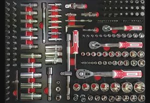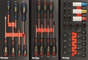 Servante d’atelier 7 tiroirs composée de 236 outils DRAKKAR. Au même titre que la boîte à outils, ce matériel leur permettra de garder toujours leurs outils et accessoires à portée de main à tout moment. Cette servante est équipée d’un plan de travail en ABS avec emplacement pour 6 tournevis et 2 aérosols, de 2 poignées intégrées pour un déplacement facile grâce à ces 4 roues dont 2 pivotantes avec frein.