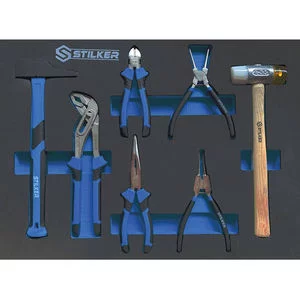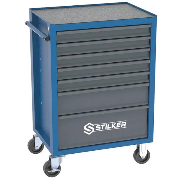 Servante d’atelier 7 tiroirs composée de 147 outils STILKER. Cette servante est dotée d’un plan de travail recouvert d’un tapis de mousse, d’une fermeture centralisée et de tiroirs montés sur glissières télescopiques.