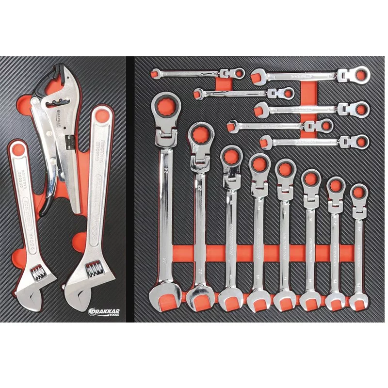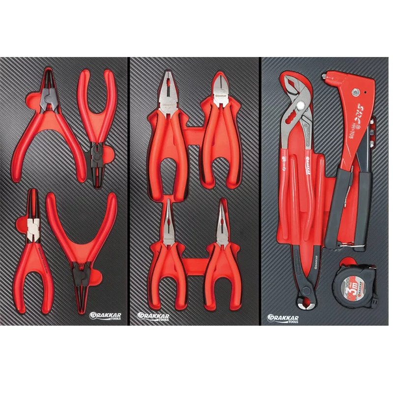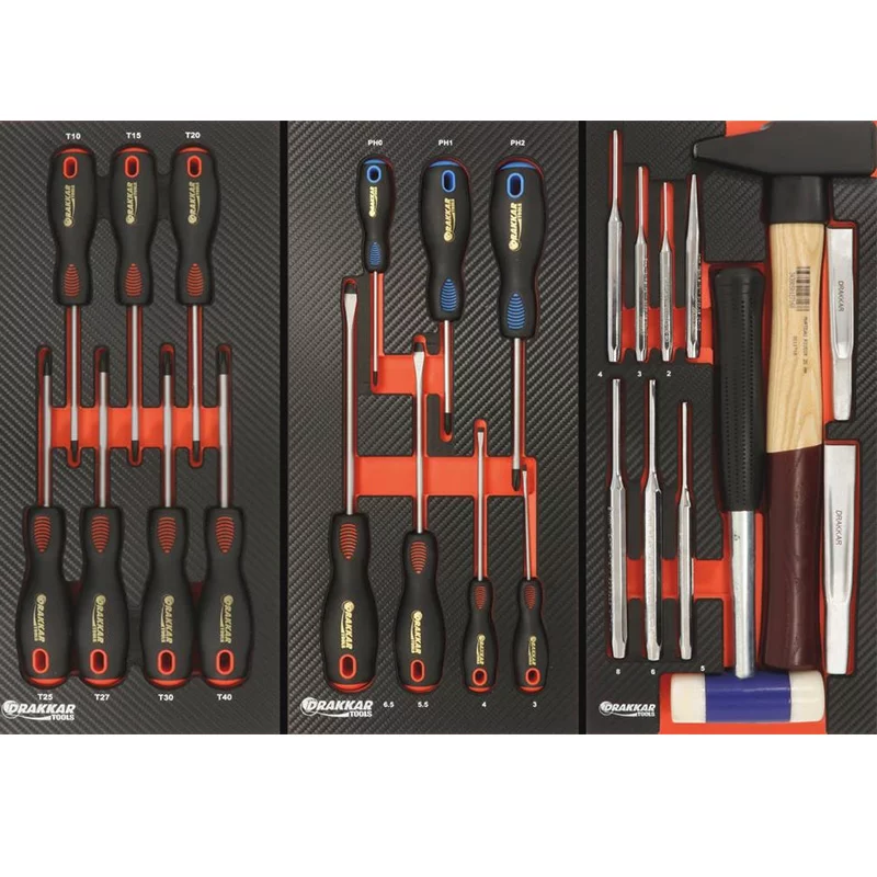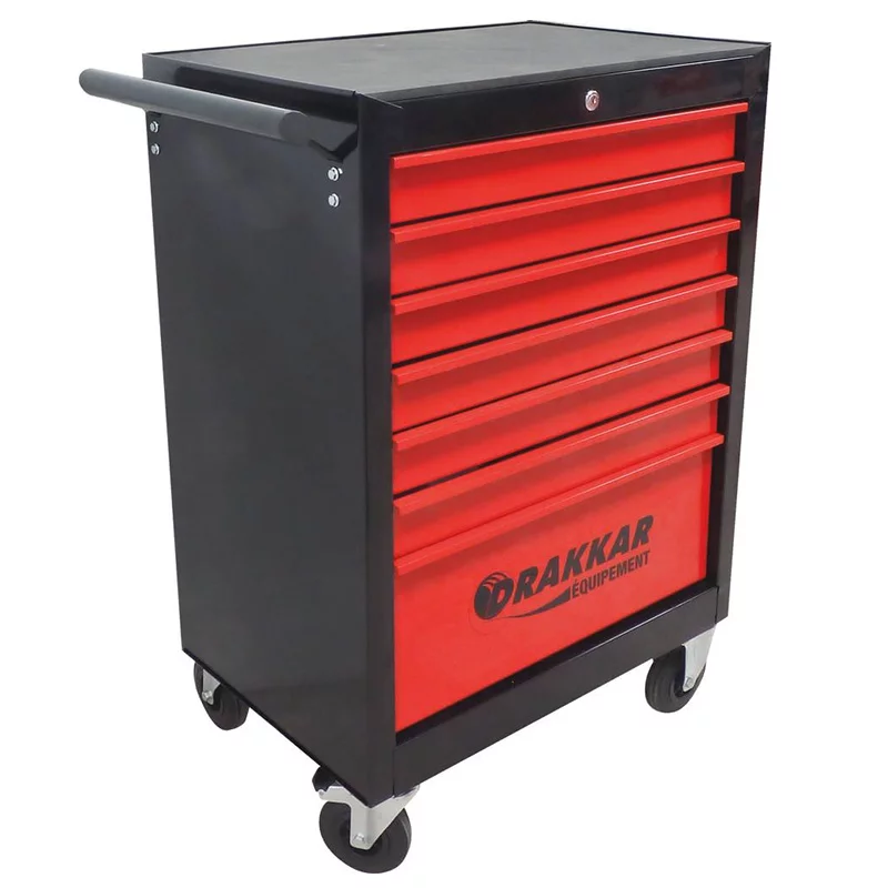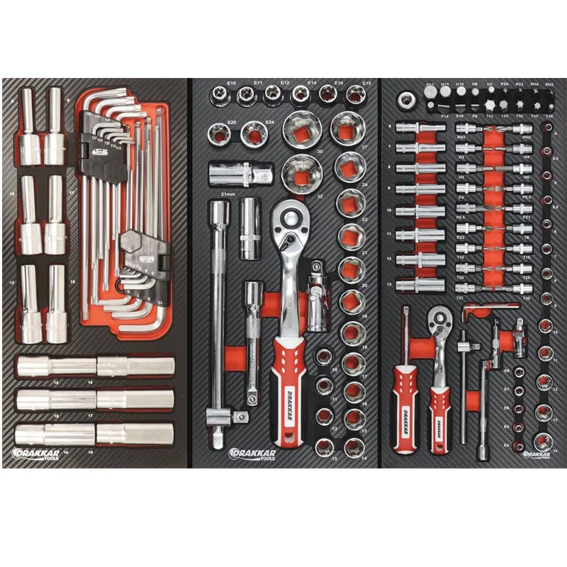 La servante vide offre 11 modules mousse avec finition carbone pour un rangement organisé et sécurisé. Elle dispose de tiroirs montés sur roulements à billes, avec une fermeture centralisée pour garantir une sécurité optimale. Ses 4 roues, dont 2 pivotantes avec frein, assurent une mobilité facile et stable, tandis que son design robuste supporte une charge importante.