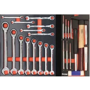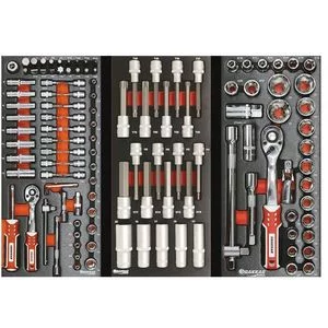 • Module: 17 douilles (10-32 mm), 5 embouts (14-22 mm), 8 embouts E-type (E10-E24), 1 douille universelle, 2 rallonges (125 et 250 mm), 1 clé à cliquet 72 dents ¼’’, 1 adaptateur 3 sens, 2 douilles à bougie (16 et 21 mm), 1 porte embouts 5/16″, 17 embouts 30 mm (TX : 40-60, PH : 3-4, PZ : 3-4, FD : 8-12, Hex : 7-14)