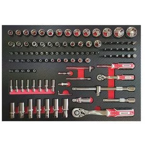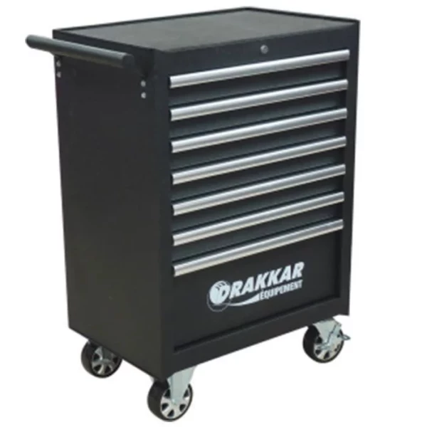 Servante d’atelier 7 tiroirs équipée de 13 modules en mousse finition carbone pleins. Servante atelier vide avec un plan de travail recouvert d’un tapis mousse. Plan de travail recouvert d’un tapis mousse. Tiroirs montés sur roulement à billes. Fermeture centralisée des tiroirs.