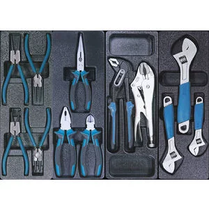 Le troisième tiroir contient des tournevis et des outils de précision, tandis que le quatrième contient des pinces, y comprenant une pince multiprise et un étau. Ce serviteur permet d’organiser et de sécuriser efficacement vos outils de travail.