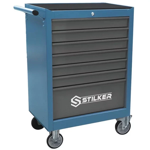 Servante d’atelier 7 tiroirs composée de 219 outils STILKER. Cette servante est dotée d’un plan detrvail recouvert d’un tapis de mousse, d’une fermeture centralisée et de tiroirs montés sur roulements à billes. Caractéristiques : Marque : STILKER Pièces dans le set : 219 outils Nombre de tiroirs : 7 Nombre de roues : 4 Charge maxi par tiroir : 1 – 45 kg – 1 – 35 kg 5 – 25 kg Dimensions intérieures des tiroirs : – 5 tiroirs 535x400x55 mm – charge maxi 25 kg – 1 tiroir 535x400x125 mm – charge maxi 35 kg – 1 tiroir 535x400x195 mm – charge maxi 45 kg. Diamètre des roues : Ø 125 mm Dimensions : 675 x 450 x 900 mm Poids : 60 kg TIROIR 1 : Module 1: (1/4″) (61 pièces) : • 1 clé cliquet 72 dents • 1 tournevis • 3 rallonges (50-100-150mm) • 1 rallonge coulissante • 23 embouts (3 plats, 3 Ph, 8 Tx, 6 Hex, 3Pz) • 13 douilles de 4 à 14 mm • 9 clés hexagonales (1,5 à 10 mm) • 1 cardan • 9 douilles longues (5 à 13 mm) Module 2: (3/8″) (24 pièces) : • 17 douilles de 6 à 22mm • 2 douilles à bougies ( 16-21mm) • 2 rallonges (75-150mm) • 1 rallonge coulissante • 1 cardan • 1 clé à cliquet 72 dents Module 3: (1/2″) (25 pièces) : • 20 douilles 1/2″ (CR-V) de 8 à 32 mm • 2 rallonges (125mm et 250mm) • 1 adaptateur pour rallonge (3/8″ (F)x1/2″ (M)) • 1 clé à cliquet 72 dents • 1 cardan TIROIR 2 : Module 1: (52 pièces) : • 12 douilles Torx® 1/4″ – E4 à E8 3/8’’ – E10 à E20 • 3 douilles tournevis Torx® ½ ‘’ (T55-T60-T70) • 2 Douilles porte-embout ¼’’ et 3/8’’ • 7 embouts Torx® ¼’’ alésés (TT8 à TT30) • 9 embouts Torx® 3/8’’ (30mm-T10 à T55) • 6 embouts Torx® 3/8’’ (75mm-T25 à T60) • 13 clés mâles coudées Torx® (T8 à T60) Module 2: (16 pièces) : • 16 clés mixtes de 6 à 24mm Module 3: (3 pièces) : • 3 clés mixtes (27-30-32mm) TIROIR 3 : Module 1: (16 pièces) : • 16 tournevis 5 tournevis plats : 6×38-3×75-5×150-6×125-8×150 4PH : 6×38-3×75-5×100-6×125 5 Torx® : T10-T15-T20-T25-T30 2 PZ : 3×75-5×100 Module 2: (13 pièces) : • 13 pièces (burins et pointeaux) TIROIR 4 : Module 1: (2 pièces) : • 1 pince multiprise 250mm • 1 pince étau 250mm Module 2: : • 1 pince coupante • 1 pince universelle • 1 pince bec long Module 3: (4 pièces) : • 4 pinces circlips