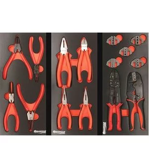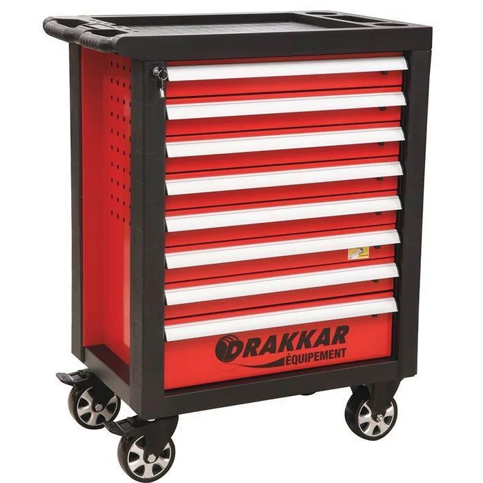 Servante d’atelier 8 tiroirs équipée de 18 modules en mousse finition métal pleins. Servante atelier vide avec un plan de travail recouvert d’un tapis mousse. Plan de travail recouvert d’un tapis mousse. Plan de travail en ABS avec empreinte pour 6 tournevis, 2 aérosols. Tiroirs montés sur roulement à billes. Fermeture centralisée des tiroirs. Ouverture sélective des tiroirs.