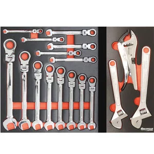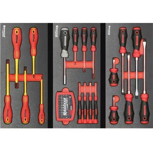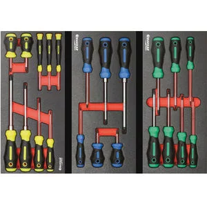 Servante d’atelier 8 tiroirs équipée de 320 modules en mousse finition métal. Servante atelier vide avec un plan de travail recouvert d’un tapis mousse. Plan de travail en ABS avec empreinte pour 6 tournevis, 2 aérosols.