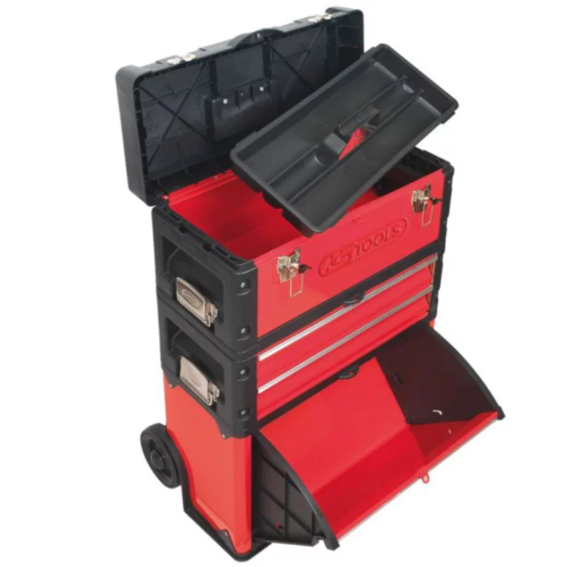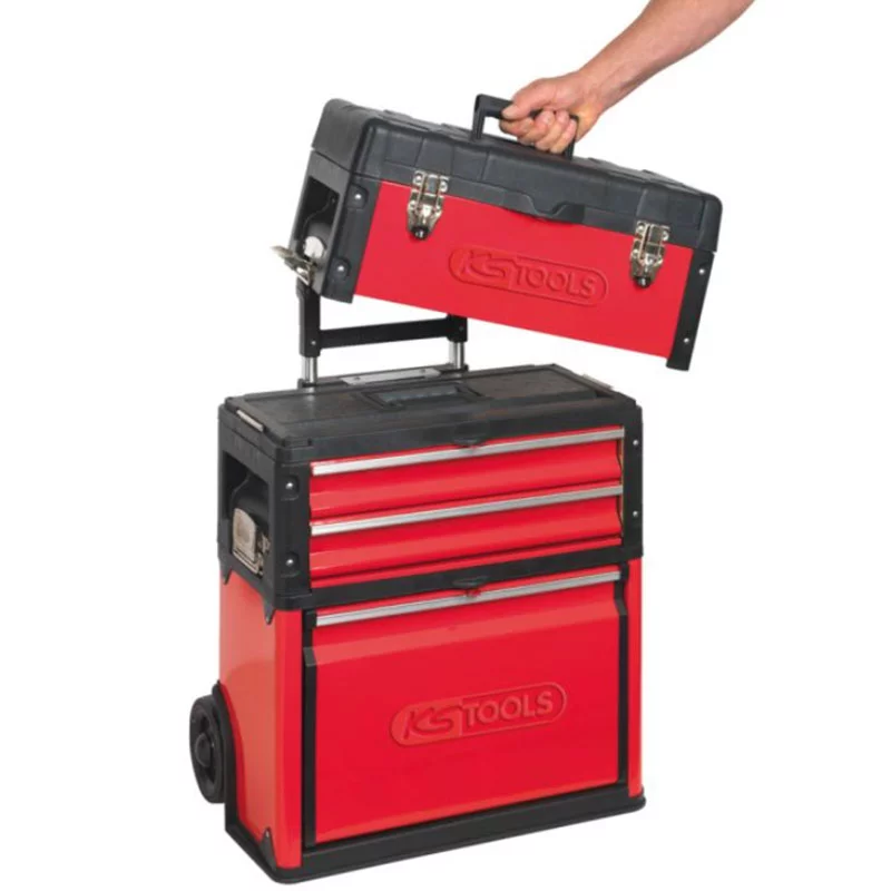Servante à outils KSTOOLS® pratique avec sa poignée télescopique et ses deux roues, servante léger et robuste, conçu en métal et PVC, modulable grâce à sa caisse à outils amovibles.