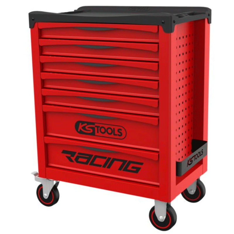 Servante d’atelier RACING KS TOOLS 7 tiroirs. Cette servante est équipée d’un système de fermeture centralisée par serrure, de glissières à roulement à billes, d’un plan de travail avec tapis en mousse, 4 roues robustes dont 2 directionnelles avec frein.