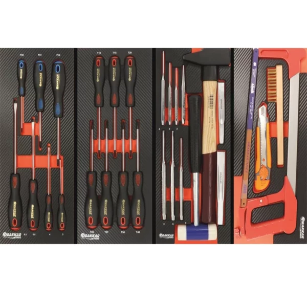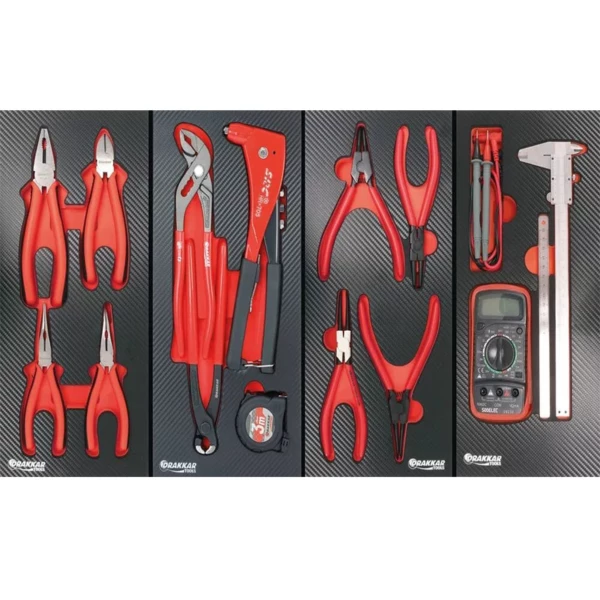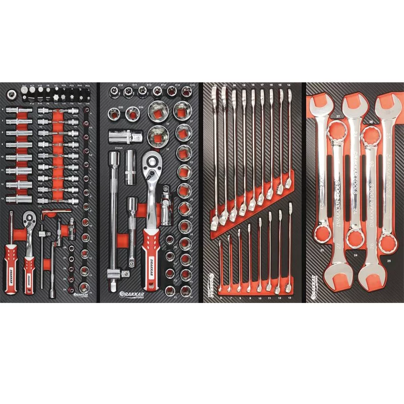 Servante d’atelier 7 tiroirs composée de 177 outils DRAKKAR . Cette servante est dotée d’un plan de travail recouvert d’un tapis de mousse et de tiroirs montés sur roulements à billes.