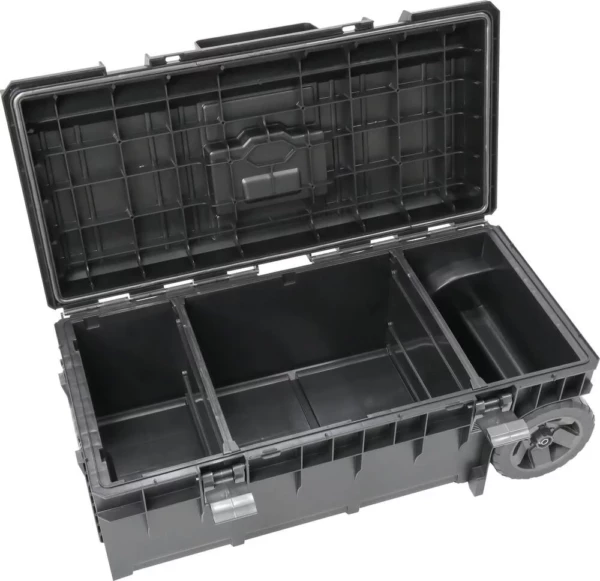 Servante COBOX facile à transporter et a manier grâce à ses roues solides avec couche de caoutchouc et de sa poignée téléscopique. De plus, elle est resistante a l’eau avec son couvercle équipé d’un joint d’étanchéité. La caisse est en PVC et son axe en métal.