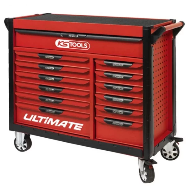 Servante d’atelier KS TOOLS offrant un rangement pour outils grâce à ses 13 tiroirs. Équipée d’un Système de fermeture centralisée par serrure, de glissières à roulements à billes, perforation normalisée pour fixer les accessoires, de quatre roues robustes dont deux directionnelles avec frein. Construction et stabilité renforcée grâce au double cornière dans les quatre angles. Non équipée d’outils.