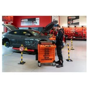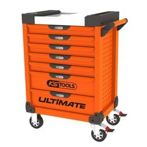 Servante ultimate 7 tiroirs orange équipée de 45 outils isolés.