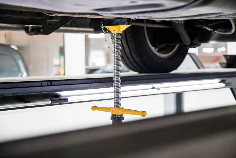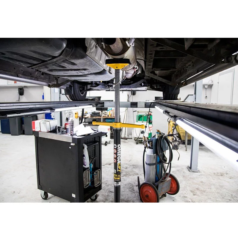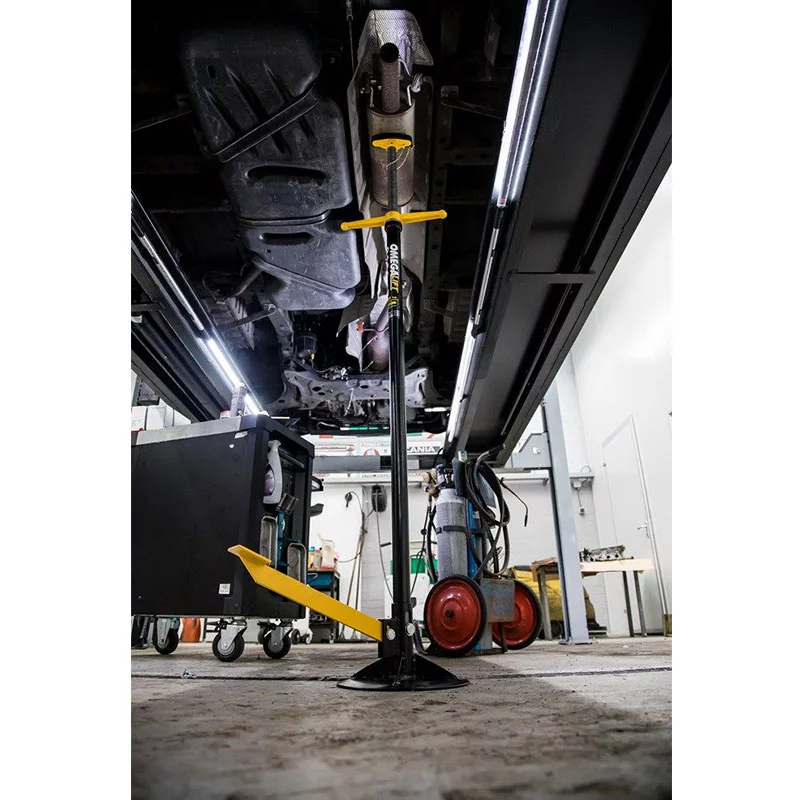 Support auxiliaire avec pédale 680 kg OMEGA. Ce support est idéal pour servir de support d’échappements, amortisseurs et autres pièces lors des travaux sous le véhicule. Le support est réglable jusqu’à une hauteur de 2.032mm et comporte une selle métallique avec protection caoutchouc, une pédale avec un rapport de 1:7 et une capacité maximum de 680 kg