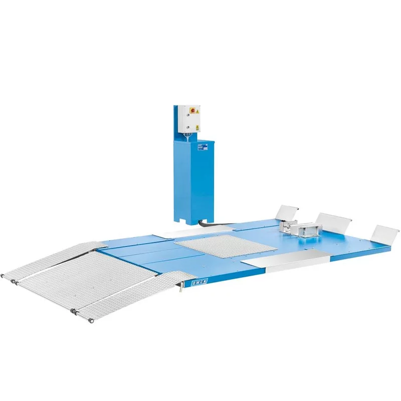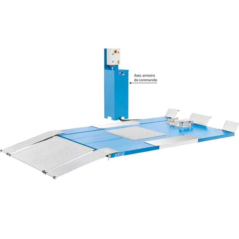 Table élévatrice fixe hydraulique pour moto/quad 600 kg, avec une armoire de commande hydraulique et une pompe hydraulique.