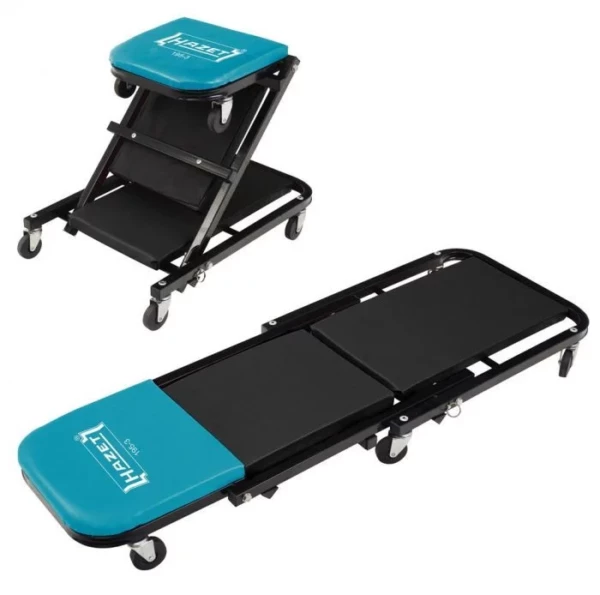 Tabouret Roulant de garagiste Hazet Marque : Hazet Hauteur de siege : 420 mm Charge maximum : 150 kg Dimensions L x L x H:  1198 x 450 x 130 mm Siège: 300 x 310 mm Poids : 10,4 kg