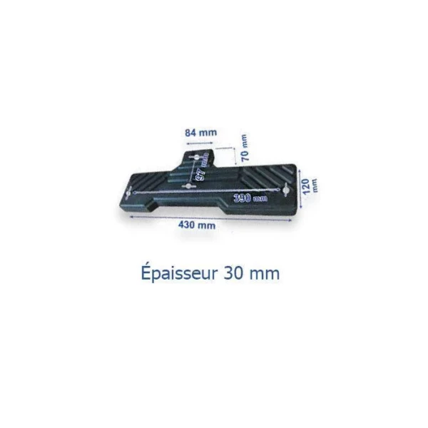 Tampon décolle-talon 430 mm, pour machine demonte pneu. Longeur: 430 mm. Largeur: 120 mm Epaisseur: 30 mm. Entraxe: voir photo.