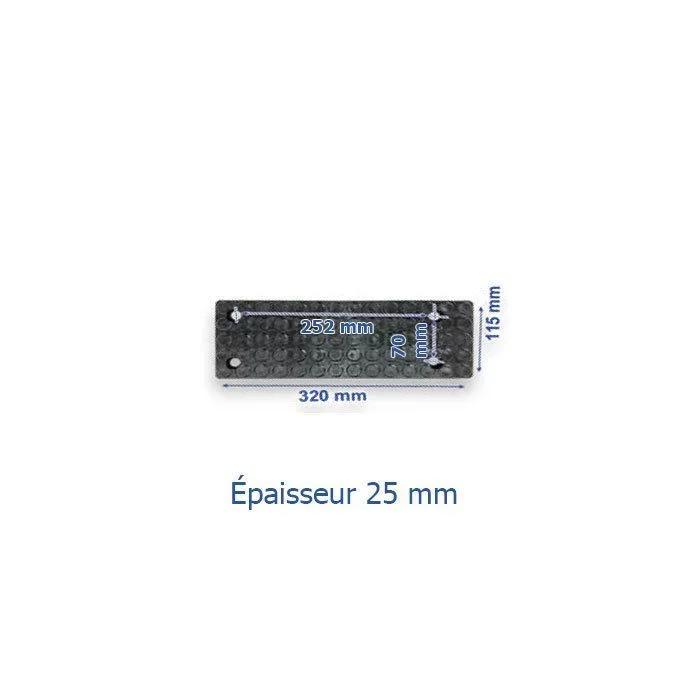 Tampon décolle-talon 320 mm, pour machine demonte pneu. Longeur: 320 mm. Largeur: 115 mm Epaisseur: 25 mm. Entraxe: voir photo.