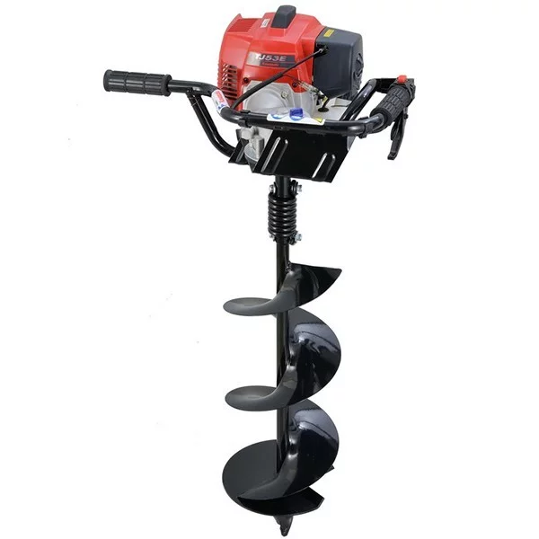 Tarière de forage thermique avec moteur 2 temps essence KAWASAKI d’une puissance de 2 kW. Cette tarière est muni d’un embrayage centrifuge et peut recevoir des mèche allant de 40 à 250 mm de diamètres.