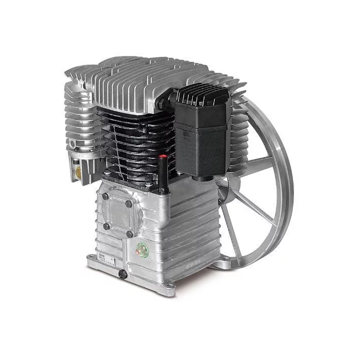 Tête de compression 2 cylindres, 2 étages. Cette tête de compression engendre un débit de 30 m3/h. Avec volant et filtre.