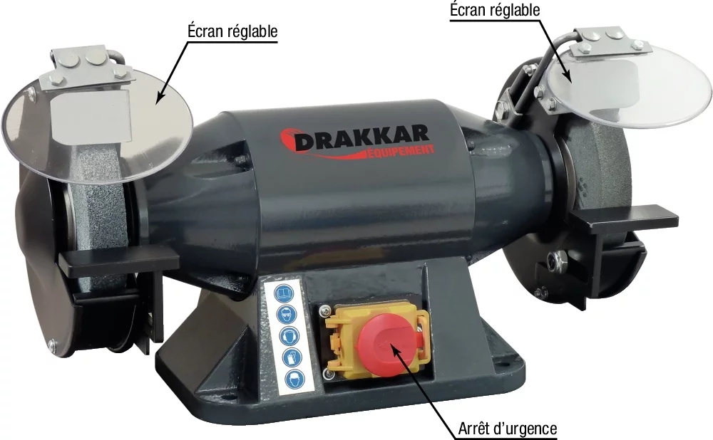 Son système de protection avec écrans transparents limite les projections et protège les yeux. Il est facile à installer sur un établi ou un pied dédié pour un meilleur confort. Touret à meuler 150 mm DRAKKAR
