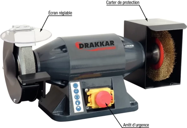 Touret à meuler DRAKKAR 150 mm. Équipés d’un interrupteur à manque de tension, d’une meule à grain 80, et d’une brosse en acier. Nos tourets sont homologués et conformes aux normes en vigueur.