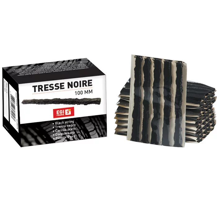 Tresse permettant d’obturer rapidement, par l’exterieur, les petites perforation (3 min maxi) sur le sommet des pneus sans chambre à carcasse radiale métallique ou à carcasse diagonale. Les tresses sont constituées d’un cordon torsadé imprégné de butyl non autovulcanisant. Quantité : 50 pièces