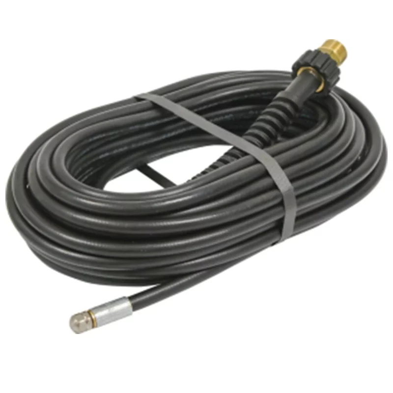 Ce produit est un tuyau déboucheur conçu pour être utilisé avec des nettoyeurs haute pression, aussi bien pour eau froide qu’eau chaude. Il est compatible avec des tuyaux ayant un diamètre de 30 à 50 mm. Ce tuyau est conçu pour des nettoyeurs ayant un débit compris entre 9 et 21 litres par minute maximum.