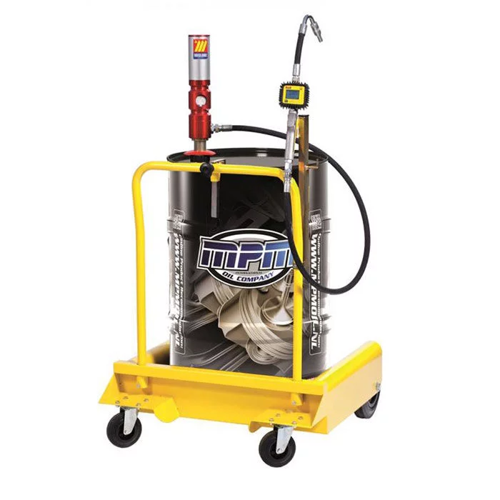 Unité de distribution d’huile mobile, équipé d’un trolley à quatre roues. Elle est aussi dotée d’une commande pneumatique avec débitmètre numérique. Convient pour récipients 180 – 220 litres.