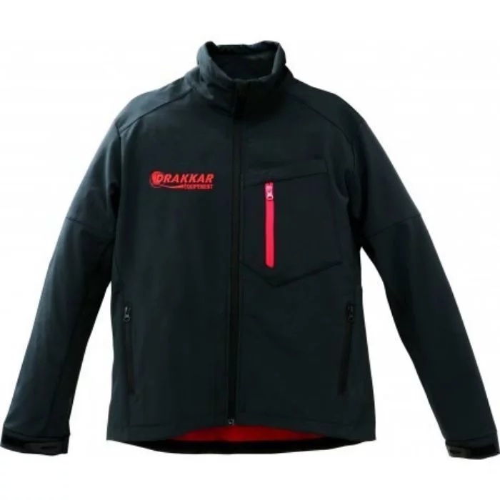 Veste de travail softshell noir Taille XL. Elle intègre son logo DRAKKAR et la fermeture de poche rouge. -Matière extérieure : Softshell (96% polyester / 4% Spandex), déperlant et respirant. -310-320 g/m2. -Matière intérieure : polaire rouge.  -Imperméabilité : 2000 mm. -Respirabilité : 600 mvp. -Fermeture éclair Jusqu’en haut du col. -Col montant avec protection du menton. -Manches avec velcro. -2 liens de serrage à la taille. -Poches : -2 grandes poches latérales avec fermeture éclair. -1 poche poitrine gauche avec fermeture velcro. -2 grandes poches intérieures.