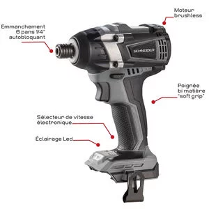Visseuse à chocs sans fil SCHNEIDER, équipé d’une poignée bi matière technologie « soft grip », d’un système de 3 couples de serrage et de 2 modes de desserrage. Livrée sans chargeur, ni batterie.